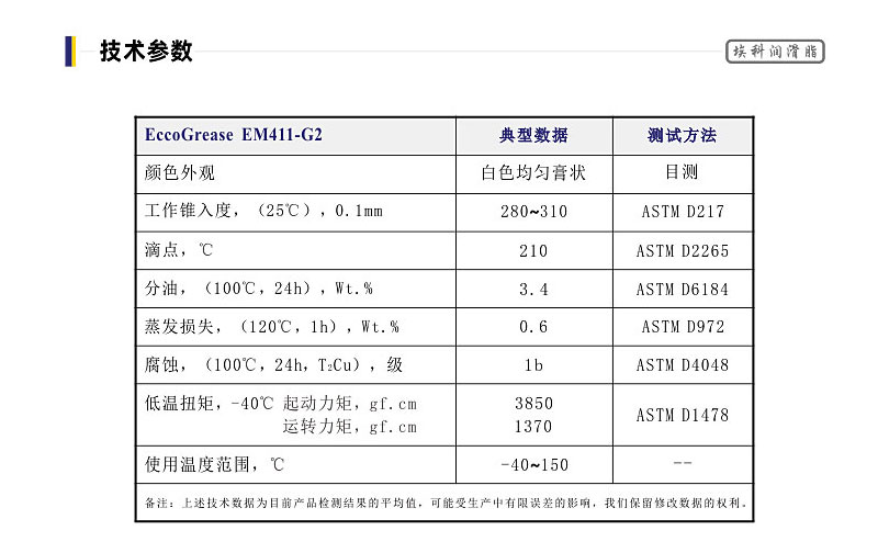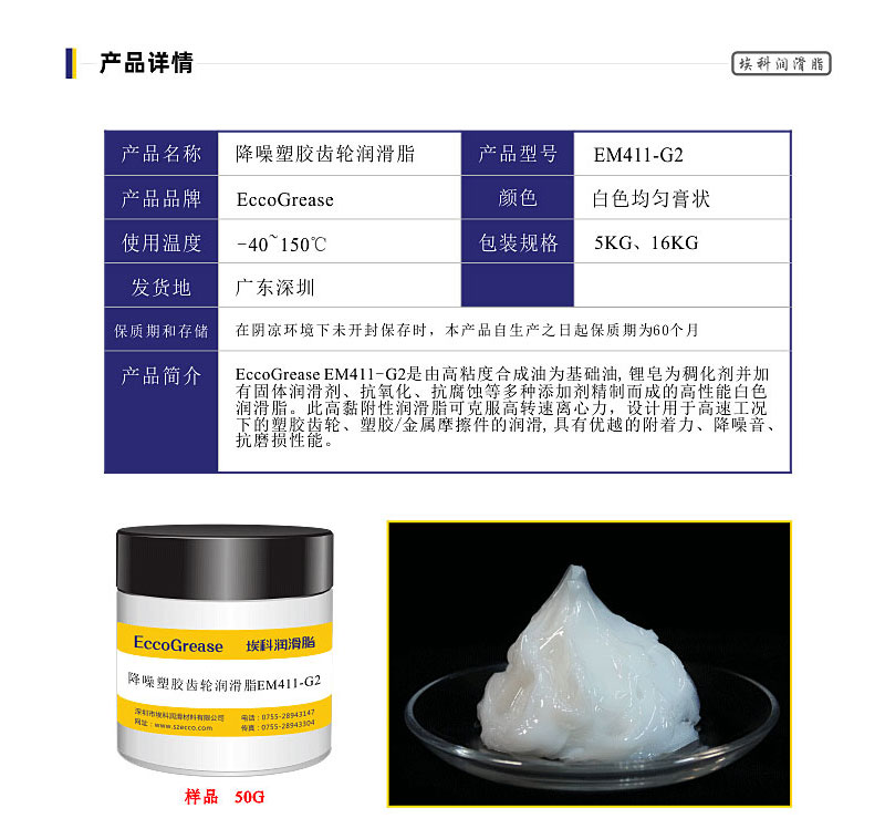 EccoGrease EM41-1是由高粘度合成油为基础油,锂皂为稠化剂并加有固体润滑剂、抗氧化、抗腐蚀等多种添加剂精制而成的高性能白色润滑脂。此高附着性润滑脂可克服高转速离心力,设计用于高速工况下的塑胶齿轮、塑胶/金属摩擦件的润滑,具有优越的降噪音、抗磨损性能。