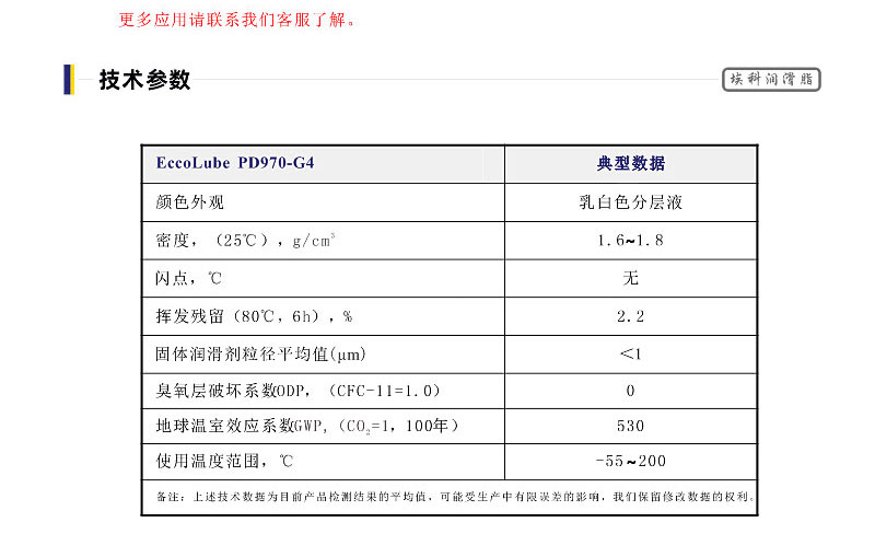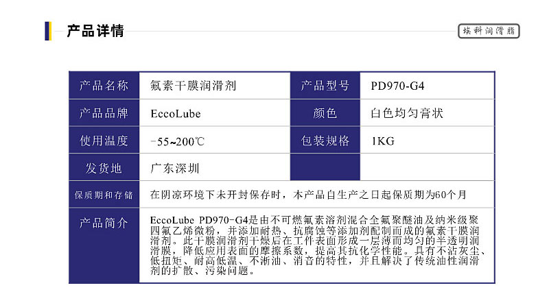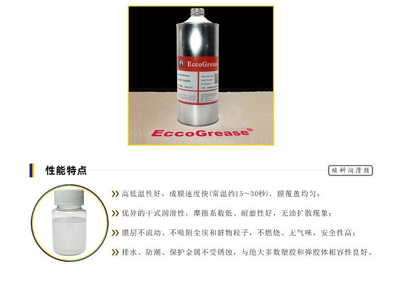 EccoLube PD970-G4是由不可燃氟素溶剂混合全氟聚醚油及纳米级聚四氟乙烯微粉,并添加耐热、抗腐蚀等添加剂配制而成的氟素干膜润滑剂。此干膜润滑剂干燥后在工件表面形成一层薄而均匀的半透明润滑膜,降低应用表面的摩擦系数,提高其抗化学性能。具有不沾灰尘、低扭矩、耐高低温、不淅油、消音的特性,并且解决了传统油性润滑剂的扩散、污染问题。