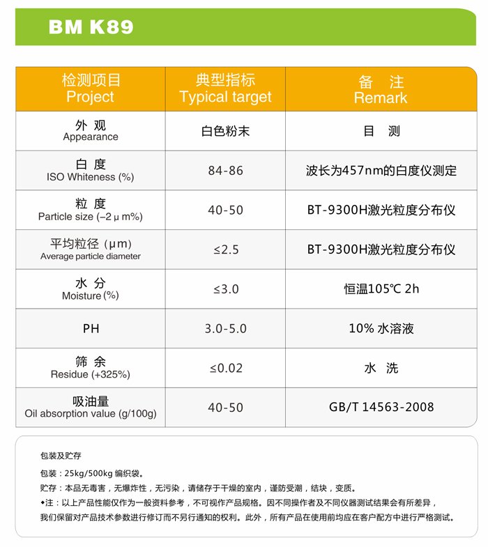 K 系列产品是专为水性涂料生产而设计的具有高白度、良好的遮盖力、平滑度、优异的触变性能、抗沉降性能及附着力优良等优点,能有效地改善涂料的贮存稳定性和抗分水性能,改善颜料的浮色发花和提高颜料的展色性;改善施工抗流挂性,提高漆膜丰满度,增强漆膜手感爽滑性,增强涂膜抗紫外线能力。为水性涂料带来更均衡的性能和更有利的竞争优势,是水性涂料中的体质颜料和多功能添加剂。