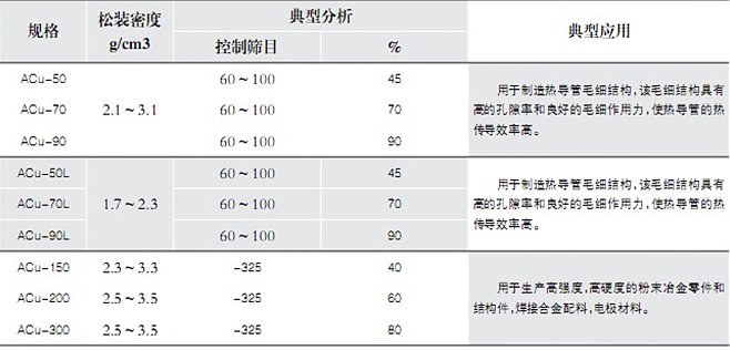 该铜粉为直接水雾化生产,铜粉呈浅玫瑰红色,具有不规则形状,其松装密度可调节、填充性能好、经过特别抗氧化处理,保存时间长,广泛应用于热传导、粉末冶金制品(铁基和铜基等)、金刚石制品、摩擦材料及焊接电极和电工合金等诸多行业。