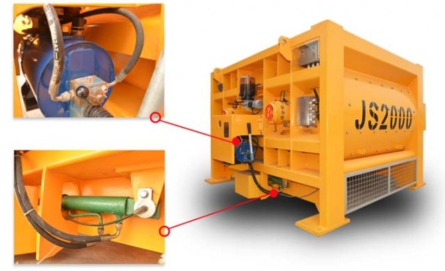 JS2000搅拌机卸料门安装在搅拌机底部,通过气缸实现气动卸料,还能控制卸料门的开闭位置,通过调整密封条的位置可保证卸料门密封。