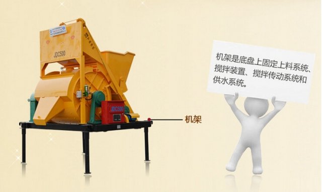 JDC500搅拌机的机架由底盘、支腿、行走轮胎部件构成。
