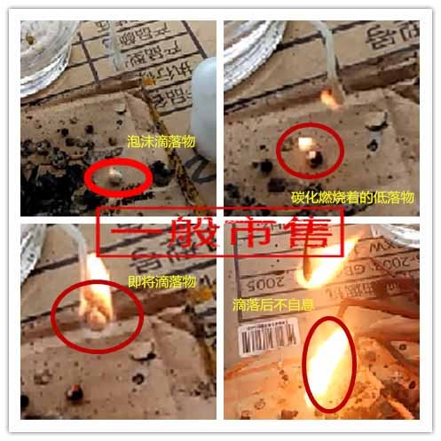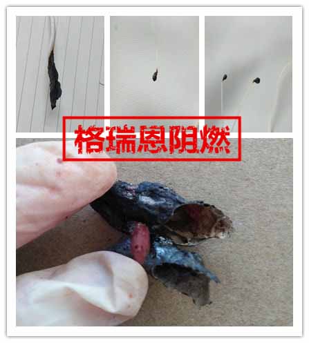 格瑞恩ZBS-2133处理过的PA6触火燃烧火势小,烟少,离火5s左右自熄,无熔滴,成碳性好,结壳成碳,阻燃性能较高;一般市售阻燃剂处理过的PA6样品,触火燃烧火势大,浓黑烟,离火长时间不自熄,伴有熔滴,熔滴滴落后继续燃烧1-3s,阻燃性能差。