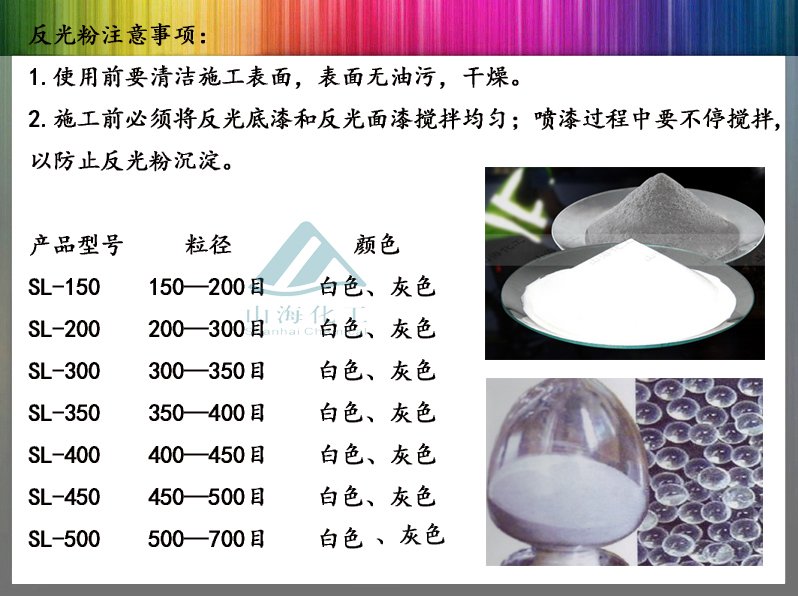深圳市山海化工颜料有限公司专业生产高折射玻璃微珠(反光粉)主要具有回归反射特性。所谓回归反射是一种光学现象,当光线照射到透镜之类的物体上,经折射后聚集,再从焦点反射又经透镜折射回归光源方向。制品采用高折射率玻璃微珠后半表面镀铝作为后向反射器,具有极强的逆向回归反射性能,能将85%的光线直接反射回光源处。回归反射所造成的反光亮度,可使驾驶人员和带光源的夜间作业人员在夜间或视野不佳的情况下清楚地看见行人和障碍目标,确保双方安全。