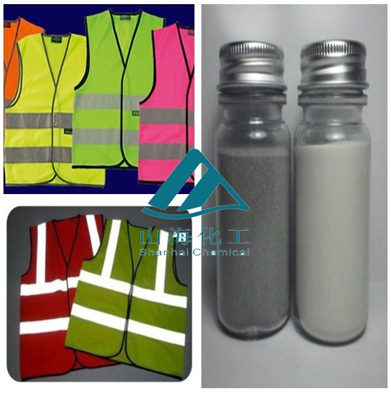 深圳市山海化工颜料热转印反光烫画:将玻璃微珠预先涂布在含有热熔胶的PVC膜上,制成反光热熔膜,根据需要,裁剪出各种文字或图案,通过热烫方式可转移到衣服、箱包、条幅等材料上,反光性能、牢固度俱佳。它改变了在服装上缝制反光标志的传统工艺,克服了图案单一,工序繁琐的缺点,不仅起到反光、安全警示作用,而且具有美观装饰作用,迎合了人们对服饰追求个性化、新潮化的心理。