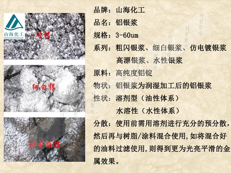 山海化工铝银浆厂家生产的树脂包裹铝银浆是使用树脂包裹铝粒子,铝颜料与树脂系统的亲和力及其优良,超强防酸碱腐蚀,优异的耐候性,优质的电气绝缘性。树脂含量为浆体重量的7.5%,厚度为0.5um,可以根据用户需要调整。