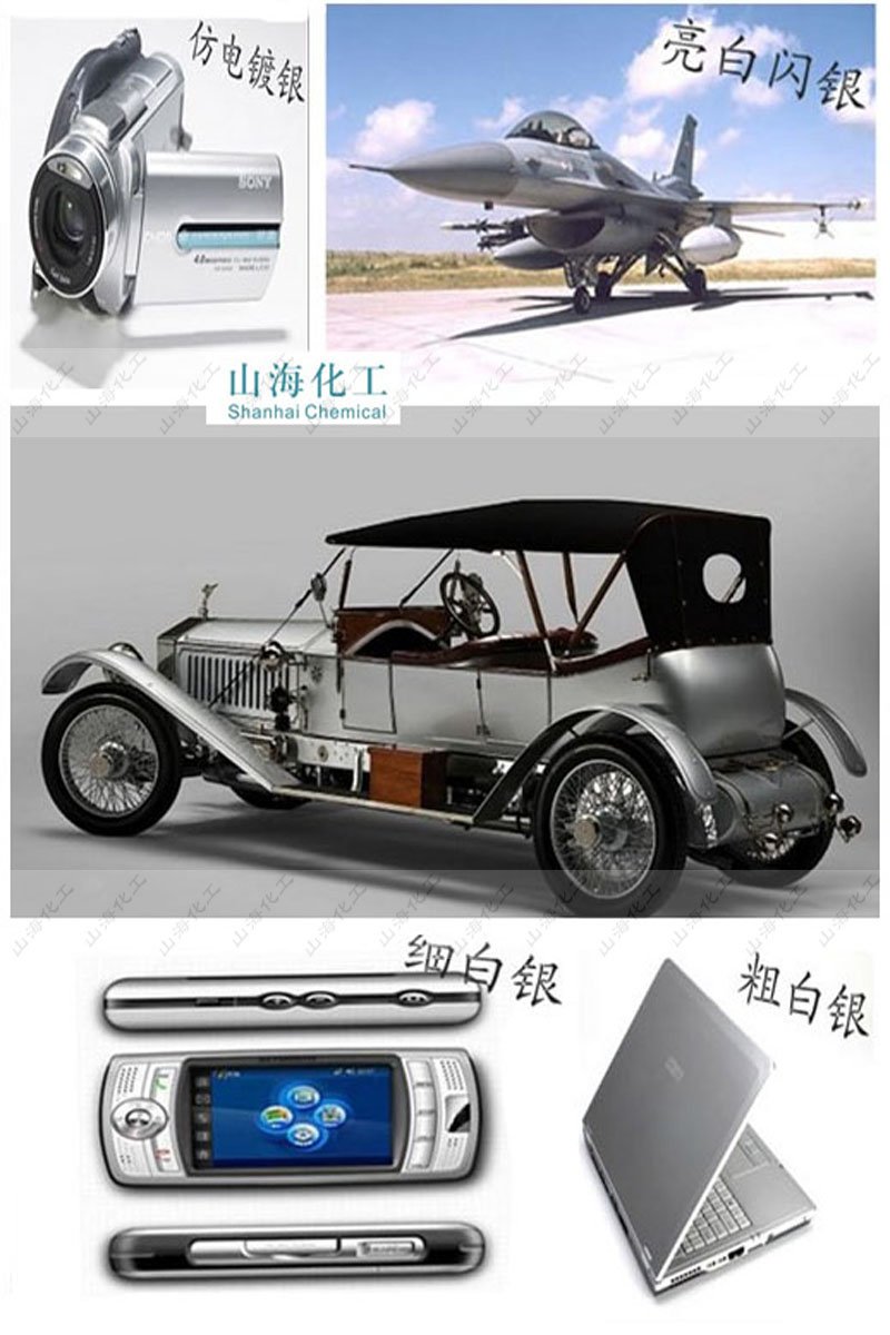 ◆漂浮型 在浮型铝银浆中,铝片在漆膜表面附近定向排列形成一层不透明的银色膜,这种不透明的性质是使浮型铝颜料成为重要的功能性原材料的主要因素。浮型铝银浆一般主要用在对防护要求较高的屋顶涂装、维护保养、防腐涂料、反光涂料、仿镀效果涂料以及商用涂料。浮型铝银浆的外观可根据颗粒的粗细有所不同,可以从粗糙、白色的外观到灰暗、高度反射或像镜面一样的效果。即能产生从平光、银白、高光(镀铬感)等效果。粗粒级的浮型铝银浆遮盖力*低,结构较粗糙,但是能获得*白、*亮的涂层。相反,细粒级的浮型铝银浆具有**的遮盖力,*光滑的结构和高反射力的涂层。 ◆非浮型 非浮型铝银浆是在整个漆膜里均匀平行的分布,所形成的涂膜外观不同于浮型铝银浆,由于它能与多种颜料混合适用于多种系统,故对工业涂装具有独特的金属感或多色效果,且具有不同程度的闪光和色彩。然而,任何颜料或染料在与非浮型铝银浆一起使用时,必须是透明的,这样才能达到一种逼真的金属效果。非浮型铝银浆种类繁多,着色力从低到高,粒径从粗到细,外观从白、闪亮到较灰、较细腻,还有耐酸系列产品,减少工业烟雾、酸雨等其它不良环境对涂料的影响。 在非浮型大类中,又可根据所采用的铝片形状及加工工艺细分为五种: 耐高温型中细闪银系列:系银元型或类银元型铝浆,适用于需要高温固化的涂料体系。该系列产品有极强的闪光效果和随角异色效果,遮盖力适中,分散性优良。产品尤其适用于汽车原厂漆(OEM)、卷材涂料和氟碳涂料。 仿电镀系列产品:是类银元状的细级别产品,其主要特点是具有良好的金属感和遮盖能力,白度较高,适用于塑料产品的涂装。 闪银系列:本系列产品分为两类:一类是粗闪银,另一类是中细闪银。 粗闪银系传统产品,具有高的金属感,遮盖力相对较差,具有价格优势,主要用于塑料漆等使用。 中细闪银是类银元状产品,粒度分布较为集中,金属感和白度较为均衡,其中位径范围为14-20μm。使用于塑料漆、汽车修补漆等。 细白银系列:细白银的典型特点是金属感较高,定位排布能力较好。中位径范围为6-15μm。适用于塑料漆和油墨体系。 漂浮型仿电镀产品:银元状产品,适用于电镀效果的烤漆,如电动车、自行车等。 而铝银浆型号则是在浮型及非浮型基础上再根据粒径的大小分类。 产品包装规格:25KG/桶 (或依客户要求)