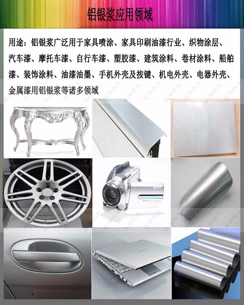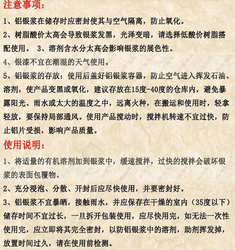使用指南: ★铝银粉与其他成分的添加比根据不同的用途和对效果的不同要求而有所变化:个初始配方中可以用1/5铝银粉和4/5其它成份。为了获得**的分散效果,应逐渐加入各成份 ★避免使用高速搅拦机以避免其运转时产生的剪切力破坏银片 ★为了达到**效果,印刷油墨或油漆的配方中应尽可能使PH值保持中性 ★由于金属颜料易发生氧化,因此使用后务必重新盖上桶盖并盖紧 ★如果使用铝银浆,请在任何时候都须盖紧桶盖以防浆料发干变硬 ★如果将铝银粉用于一个有一定贮存期限的配方中,须事先用少量样品进行试验。