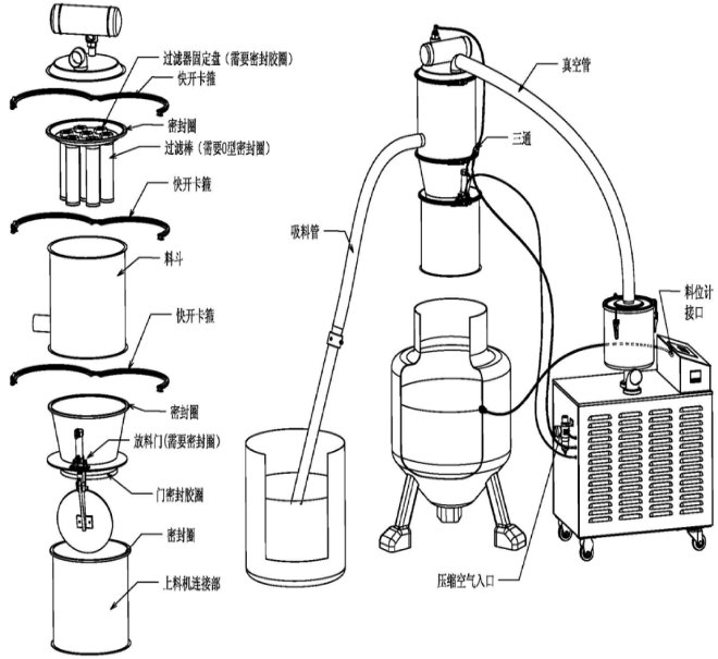 泽瀚电动真空上料机是利用电动真空泵作为真空源的一种真空输送机,利用该真空加料机可以将物料从容器中直接送入混合机、反应器、料斗、压片机、包装机、振动筛、整粒机、湿法制粒机、干法制粒机和粉碎机中去。该机减轻了工人的劳动强度,杜绝了粉尘污染,保证生产符合“GMP”要求。