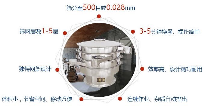 任何颗粒、粉末、粘液一定范围内均可筛选。筛分*细至500目或0.028mm, 过滤*小可至5微米。分级筛选,可筛一至五层筛网,能同时进行二至六个等级的分选或过滤。效率高、设计精巧耐用,换网容易、操作简单、清洗方便。三元旋振筛杂质、粗料自动排出,可以连续作业。独特网架设计,筛网使用时间长久,换网快,只需3—5分钟。体积小,节省空间,移动方便。