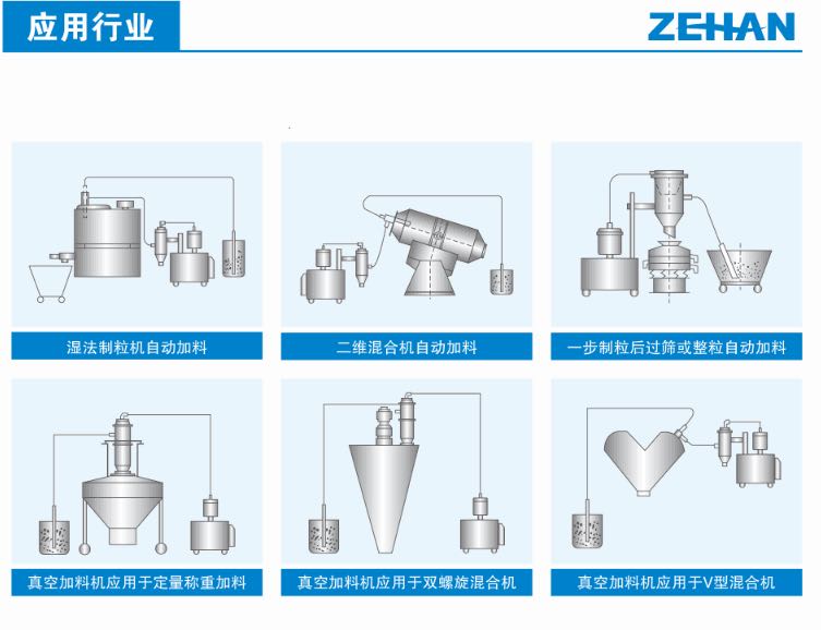 真空加料机是利用电动真空泵作为真空源的一种真空输送机,利用该真空加料机可以将物料从容器中直接送入混合机、反应器、料斗、压片机、包装机、振动筛、整粒机、湿法制粒机、干法制粒机和粉碎机中去。该机减轻了工人的劳动强度,杜绝了粉尘污染,保证生产符合“GMP”要求。