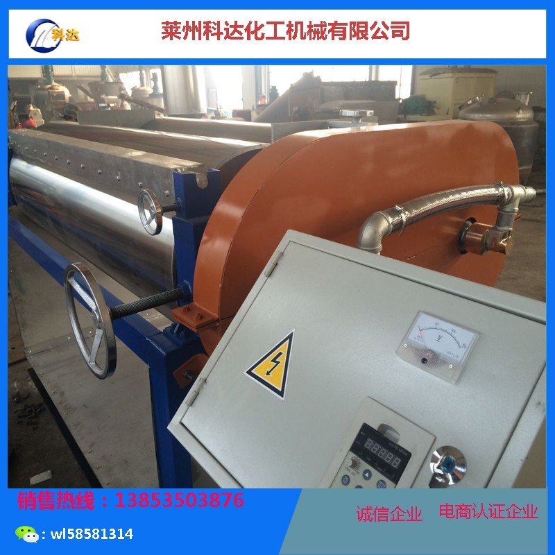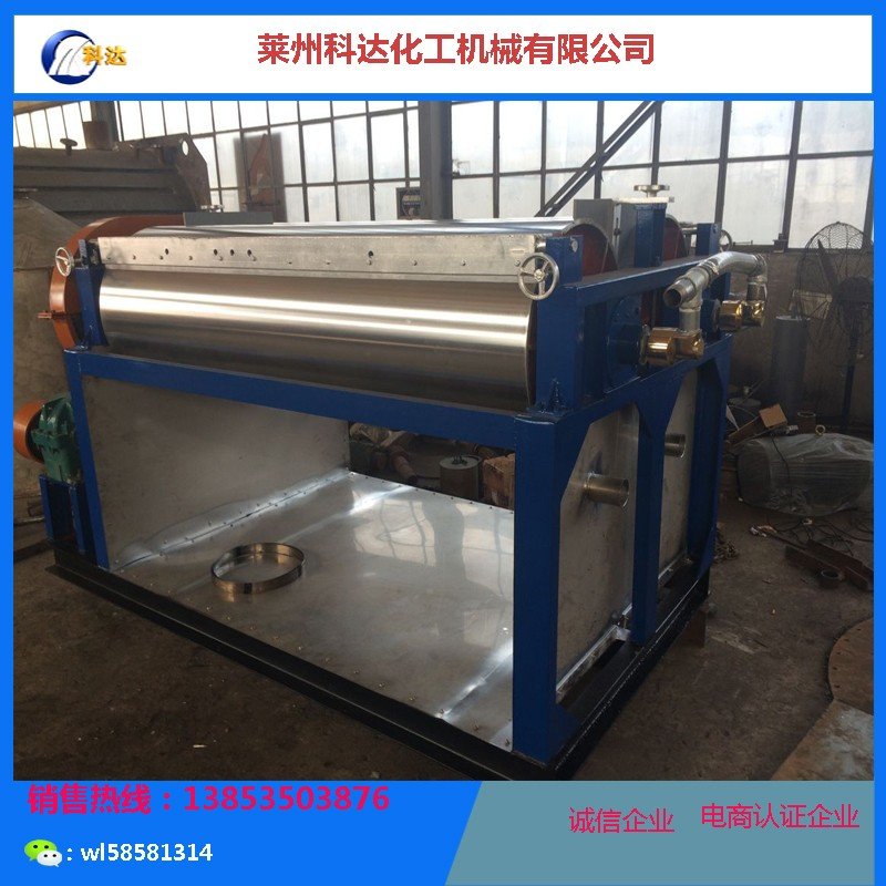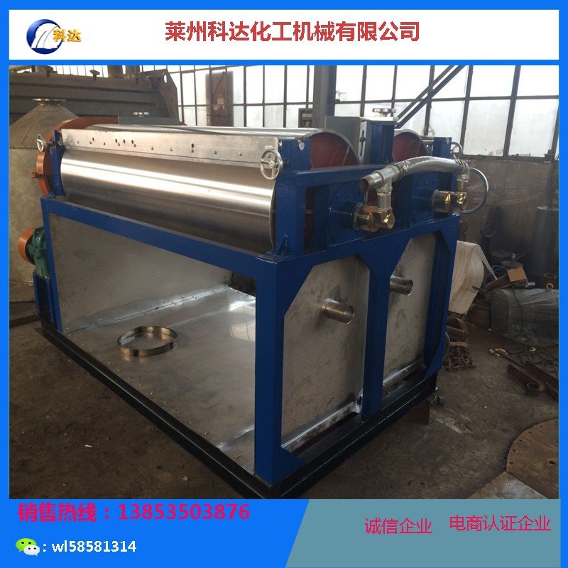 两辊压片机:本设备主要用作:稳定剂制片、熔融法硬脂酸锌制片、聚乙烯蜡制片等。本设备由两支中空辊筒、传动齿轮、调速电机、减速机、刮料系统、电器控制系统组成。辊筒采用无缝钢管金加工后表面镀硬铬处理,或者采用不锈钢管加工,内通冷却水,辊筒之间间隙可调,生产出的产品光亮平滑,厚薄均匀。刀片采用弹性材料,经久耐用。规格有500X1200,500X1500,根据产量选择型号。 600*1500 600*1800