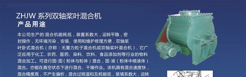 ZHJW系列卧式桨叶混合机能耗低,装置系数大,运转平稳,密封操作,无环境污染,安装、使用和维护修理方便,ZHJW系列卧式桨叶混合机(亦称:无重力粒子混合机或双轴桨叶混合机),它广泛应用于化工、农药、医药、染料、饮料、食品添加剂等行业的物料混合加工。可进行固-固(粉体与粉体)混合,固-液(粉体中喷液体)混合。亦能在真空状态下进行混合、干燥作业。该机具有混合速度快,混合精度高,不产生偏析,混合过程温和及耗能低,装填系数大,运转平稳,密封操作,无环境污染,安装、使用和维修方便等特点。