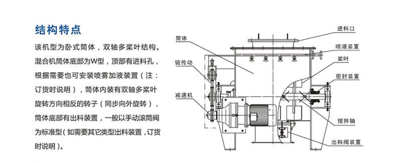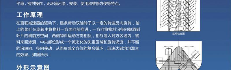 在直联减速器的驱动下,链条带动双轴转子以一定的转速反向旋转,轴上的桨叶在旋转中将物料一方面向前推进,一方向将物料沿径向抛洒到叶片的斜前方空间,两侧物料运动方向相反,相互溶入对方区域内,物料来回渗混,中央部位形成一个流态化的失重区域和旋转涡流,并不断的沿轴向、径向移动,从而形成全方位的复合循环,迅速达到均匀混合的效果。