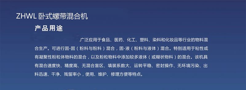 ZHWL系列卧式螺带混合机由U形筒体、螺带搅拌叶片和传动部件组成;螺带状叶片一般做成双层,工作时外层螺带将物料从两侧向中央汇集,内层螺带将物料从中央向两侧输送,形成了二个循环物流。搅拌部件还可以制作成桨叶式或增加飞刀,适应不同的物料。