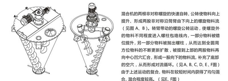 南京鑫淳银VZH立式双螺旋锥形混合机(粉体混合搅拌机械)两非对称螺旋的快速自转,物料向上提升、形成两股非对称沿筒臂由下向上的螺旋物料流(见图A、B)。转臂带动的螺旋公转运动,使螺旋外的物料不同程度进入螺柱包络线内,一部分物料被错位提升,另一部分物料被抛出螺柱,从而达到全圆周方位物料的不断更新扩散,被提到上部的两股物料再向中心凹穴汇合,形成一股向下的物料流,补充了底部的空穴,从而形成对流循环。(见A、B、C、D、E图)由于上述运动的复合,物料在较短时间内获得了均匀混合,混合程度较高。(见E、F图)