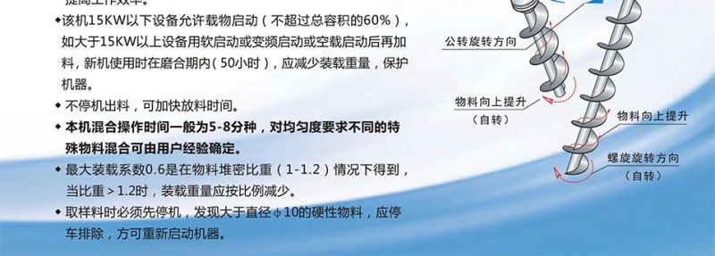 本机广泛应用于化工、化肥、油田、炼油、农药、兽药、涂料、颜料、染料及助剂、冶金、冶炼、耐材、矿山、建材、电子塑料、饲料、养殖业、医药、生物工程、食品、保健品、陶瓷、玻璃以及新材料、核能材料等行业的固──固(即粉体与粉体)混合、固──液(即粉体与液体)混合、液──液(即液体与液体)混合。该机对混合物适应性广,对热敏性物料组成的混合不会产生分层离析现象。对粗料、细粒和超细粉等各种颗粒、纤维或片状物料的混合有很好的适应性。