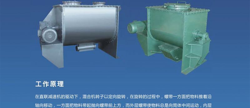 ZHWL系列卧式螺带混合机由U形筒体、螺带搅拌叶片和传动部件组成;螺带状叶片一般做成双层,工作时外层螺带将物料从两侧向中央汇集,内层螺带将物料从中央向两侧输送,形成了二个循环物流。搅拌部件还可以制作成桨叶式或增加飞刀,适应不同的物料。