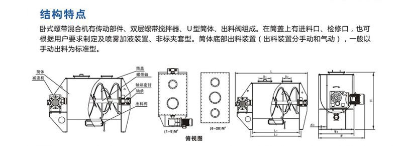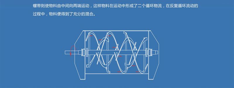 混合机筒体底部中央开设出料口,外层螺旋带的蜗旋结构配 合主轴旋转方向驱赶筒壁内侧物料至中央出料口出料,确保筒体内物料出料无死角。筒盖可做成拱形或全开式,拱形可以承压,全开式方便清洗设备内部。本机的优点是适用范围广、混合均匀度高、混合时间短、装载系数大。