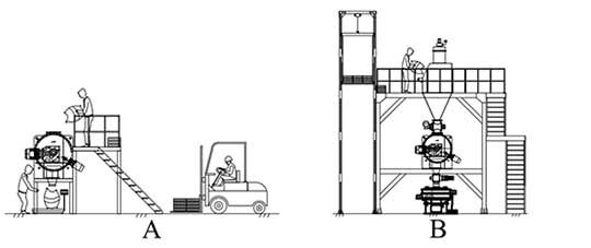 配置B:吊车送料→人工投料至带除尘的投料站→混合→行星卸料阀匀速出料→振动筛