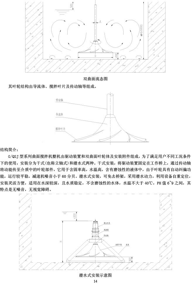 1 安装前由合格电工检查电机、电器,并确定转向,叶轮离池底的*小工作距离应≤300mm,且池底平