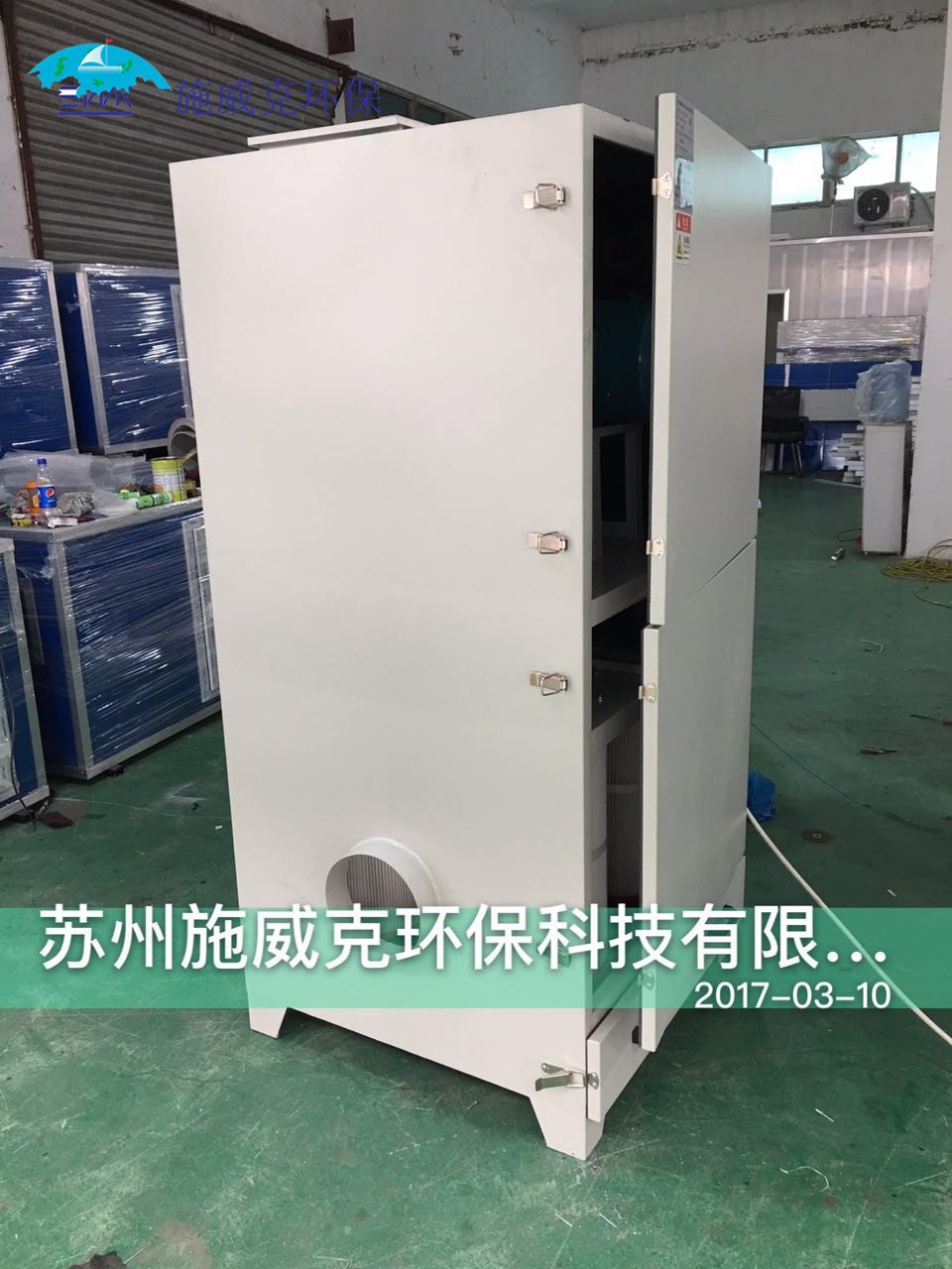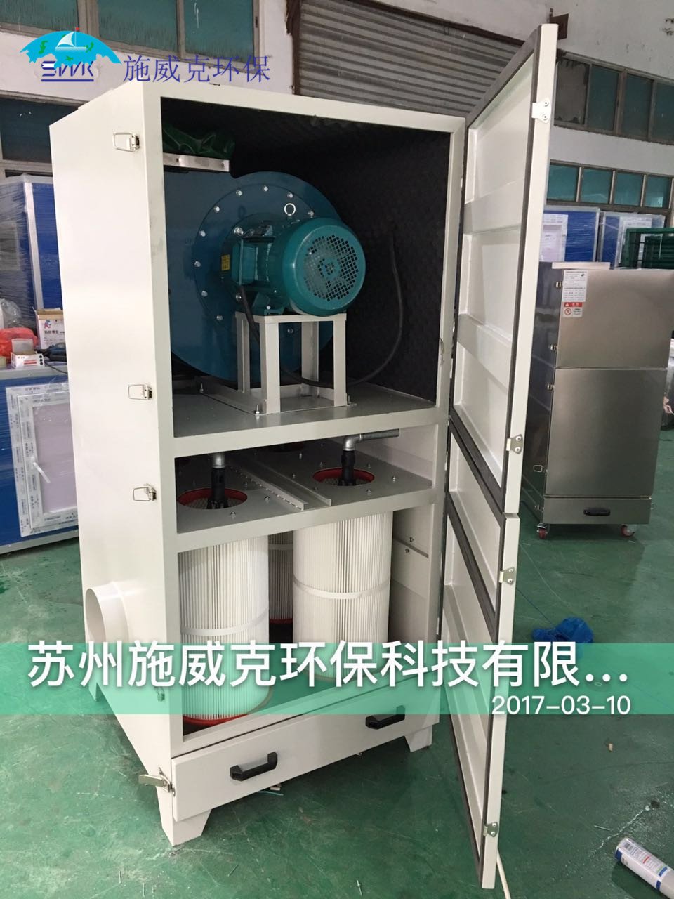 含尘气体由进风口进入箱体,由滤袋(扁布袋)进行过滤,粉尘被阻留在滤袋表面,净化后的气体由风机进过风口排出箱体外,直接排入室内(亦可接风管排到室外)。随着主机连续工作,滤袋外面粘附的粉尘不断增加,使设备阻力不断上升,为此必须进行清灰,使粘在滤袋外面的粉尘抖落下来,经灰抖落至集尘器(抽屉)中,由人工清除。