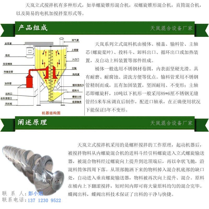 立式搅拌机是我公司自主研发,并实施生产的主打产品,其设计理念围绕,经济,实惠,实用,广泛,进行设计,在生产中克服了多项技术难题,附带烘干功能,要比传统的搅拌机烘干速度更快,更省电!普通干燥机干燥时,由于原料是静止的,热风穿透不充分,只在局部受热,原料易结块,造成堵塞,故无法达到全面干燥的效果。本机的设计为两级螺旋快速输送,**级将原料快速递入桶内,第二级再将原料不停快速提升到桶体上端以伞状飞抛散落,而热风则从桶体下部的中心向四周吹出,顺利的从移动原料的缝隙中自下向上穿透原料进行全面热交换的动态干燥过程。