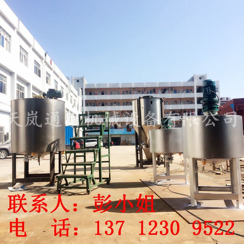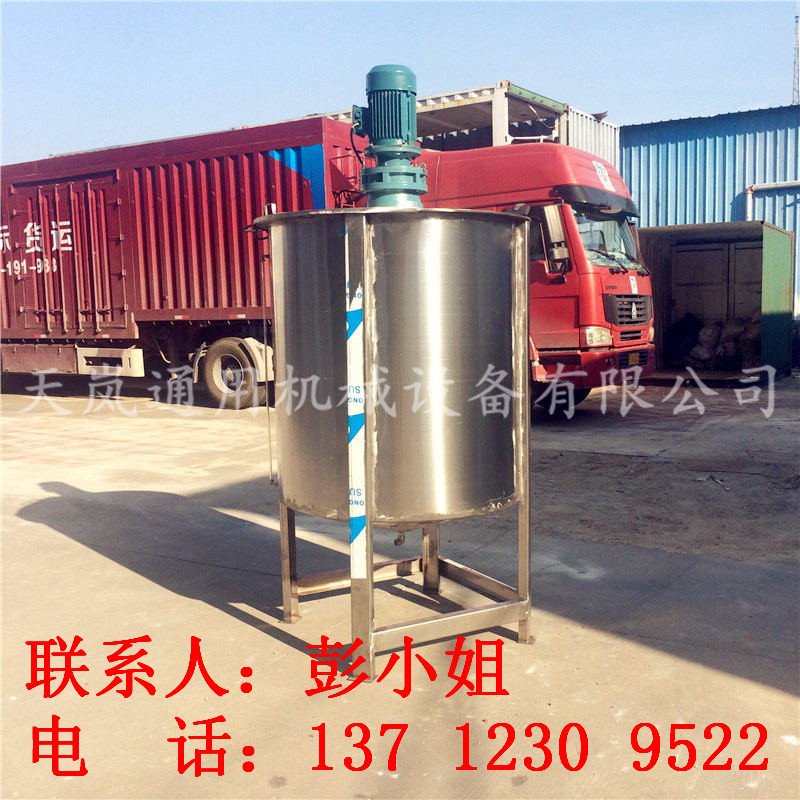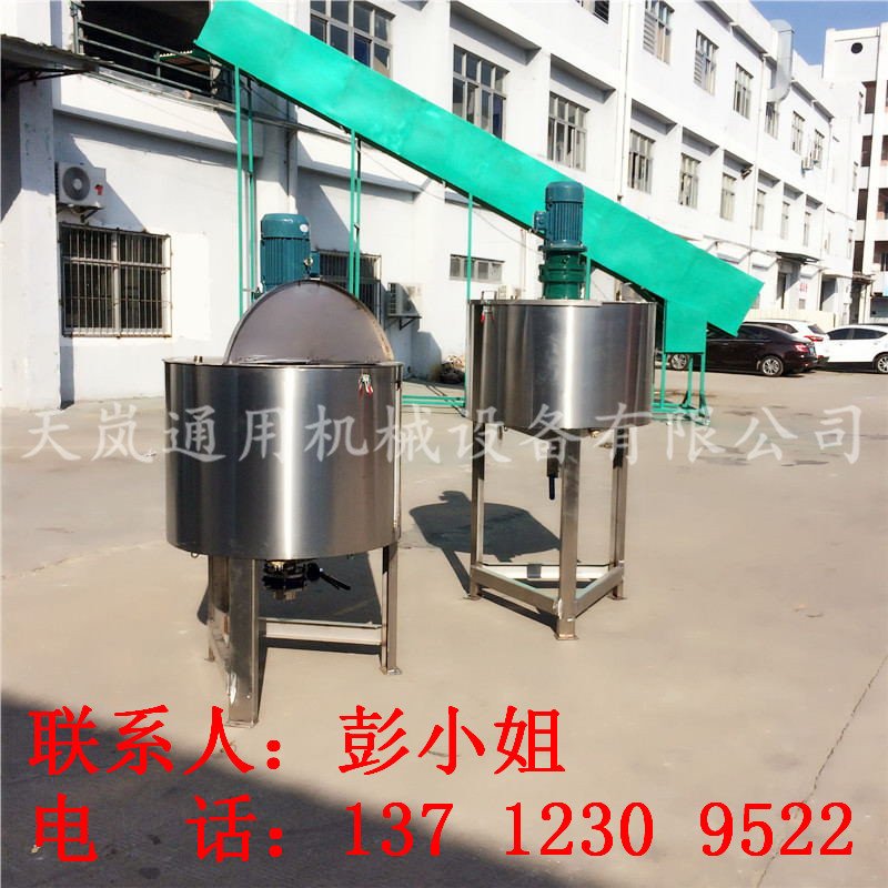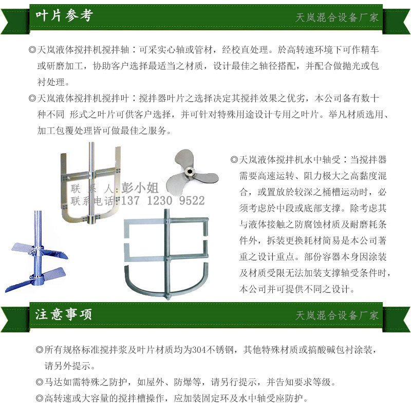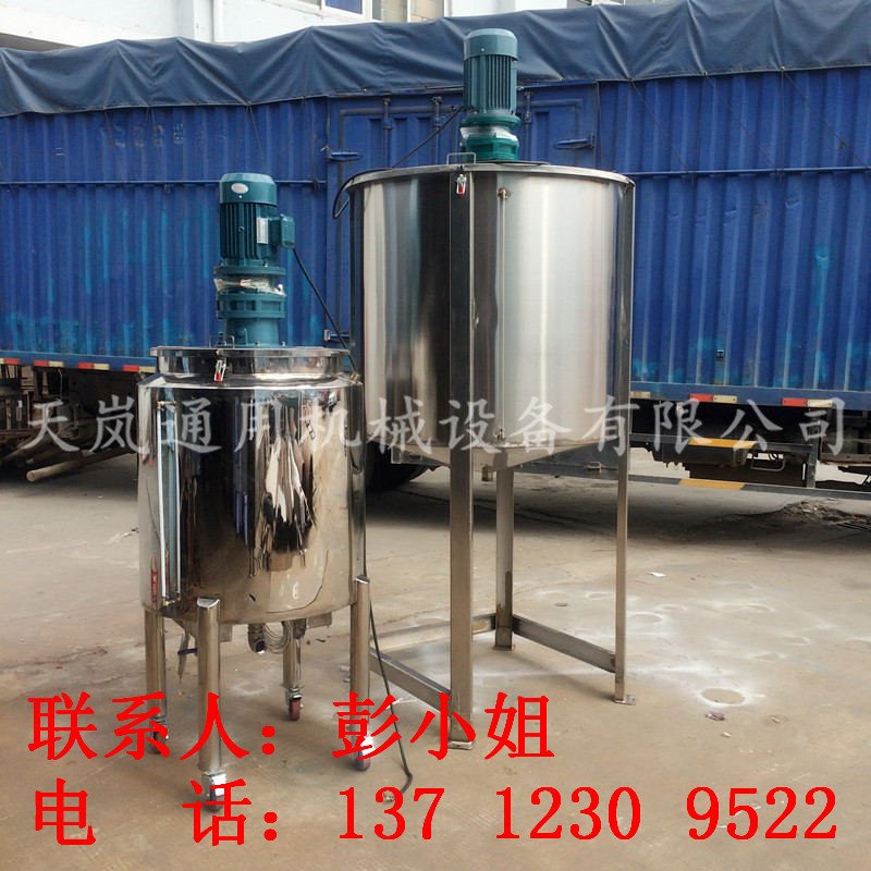 液体搅拌机涉及行业广泛,每个客户的具体情况、要求也各不相同,所以搅拌机品种多样,针对不同客户需要单独设计的非标准设备。天岚液体电加热搅拌机应用于液体的加热物体,如酸碱液、化学试剂、水、油等。一般以导热油为有机热载体或热介质油,导热油为介质加热温度比较高。若温度要求不高,也可以用水作为中间传热介质。多数客户选择用不锈钢材质制作,如:304、316不锈钢等为主,具有机械强度高、耐热、抗腐、不易结垢等优点。天岚机械满足您的要求,人性化设计,根据实际需要订做!