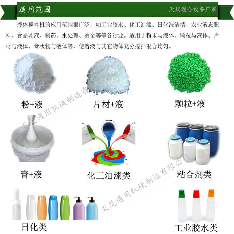 液体搅拌机概述:广泛应用于涂料、医药、建材、化工、颜料、树脂、食品、科研等行业。该设备可根据用户产品的工艺要求选用碳钢、不锈钢等材料制作,以及设置加热、冷却装置,以满足不同的工艺和生产需要。加热形式有夹套电加热、盘管加热,该设备结构设计合理、工艺先进、经久耐用,并具有操作简单、使用方便等特点,是理想的投资少、投产快、收益高的化工设备。