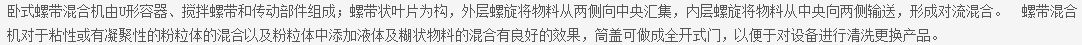 1、该机型为卧式筒体,单轴双螺带对称分布结构。混合机筒体为U型,在顶盖或筒体上部有进料口,根据用户需要其上可装喷雾加液装置。筒体内装有单轴转子,转子是由轴、横撑及螺带组成。