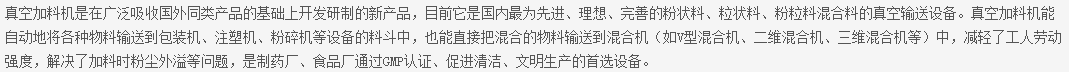 1、真空加料机由真空泵(无油、无水)、不锈钢吸料咀、输送软管、PE过滤器(或316L不锈钢过滤器)、压缩空气反吹装置、气动放料门装置、真空料斗和料位自动控制装置等组成,整套系统设计合理、制造精美。