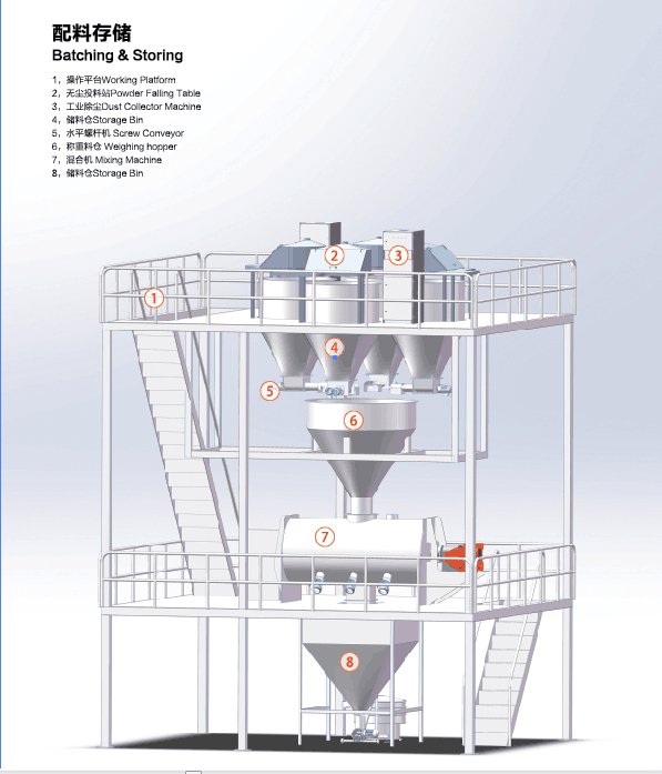 人工无尘拆包→原料暂存→螺杆计量输送→称重料仓暂存→输送→混合机→产品暂存