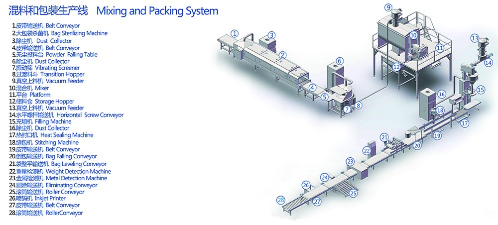 脱包输送→紫外线杀菌→输送→人工无尘投料→过筛→过度料斗缓存→负压输送→混合→暂存→负压输送→水平螺杆输送→大袋包装→封口→缝包→输送→倒包输送→袋整平→输送→重量检测→金属检测→输送→喷码→输送