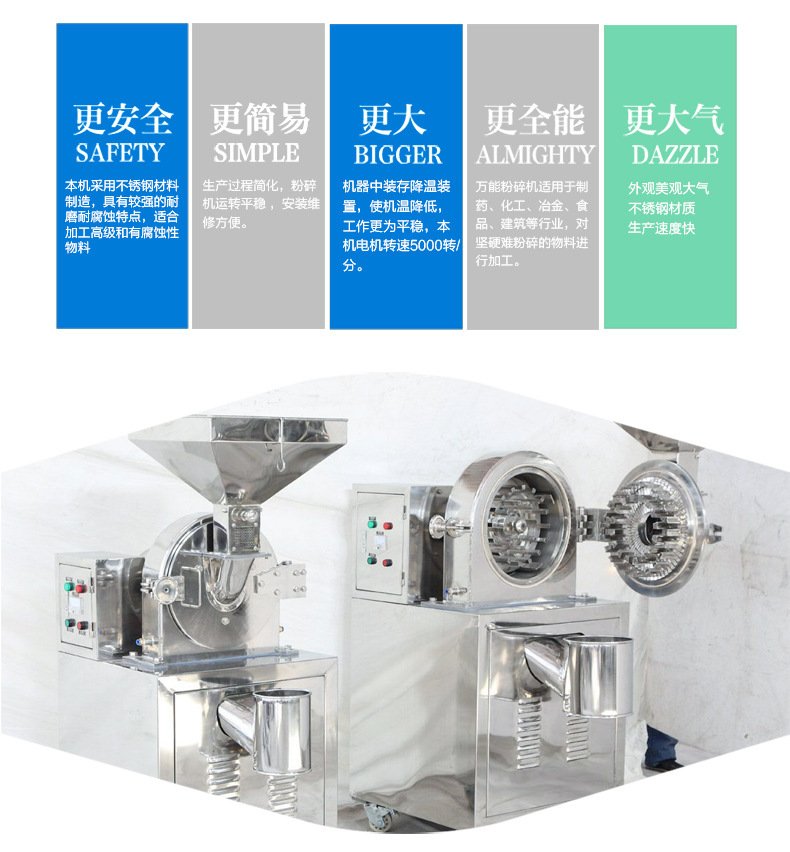本机组与粉碎物料相接触的零件全部采用不锈钢材料制造,有良好的耐腐蚀性,机架四周全部封闭,便于清洗,机壳内壁全部经机加工,达到表面平整、光滑。使药品、食品、化工等生产更能符合国家“GMP”标准。本机组目前为国内**生产。
