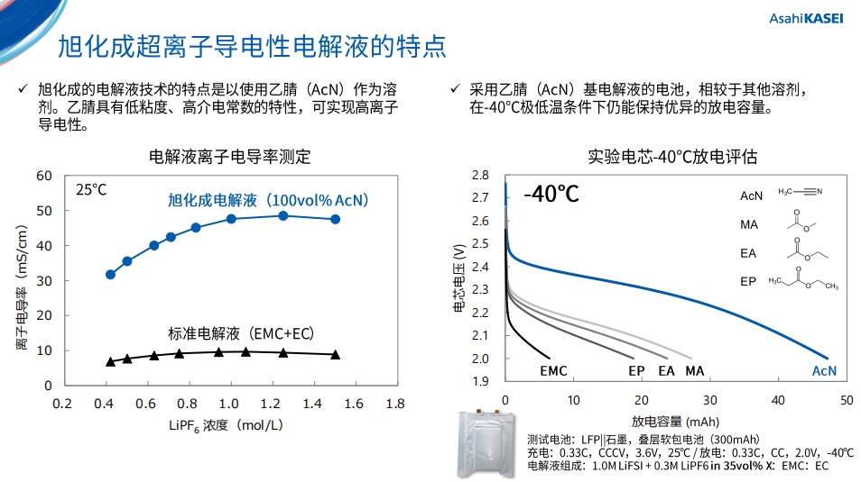技术方面,低温性能与高功率输出是“铅改锂”的核心痛点。旭化成乙腈电解液为整个行业提供了一个解决方案。飯塚裕人博士表示,除了低温性能,乙腈电解液在循环寿命、快充性能方面也有提升。