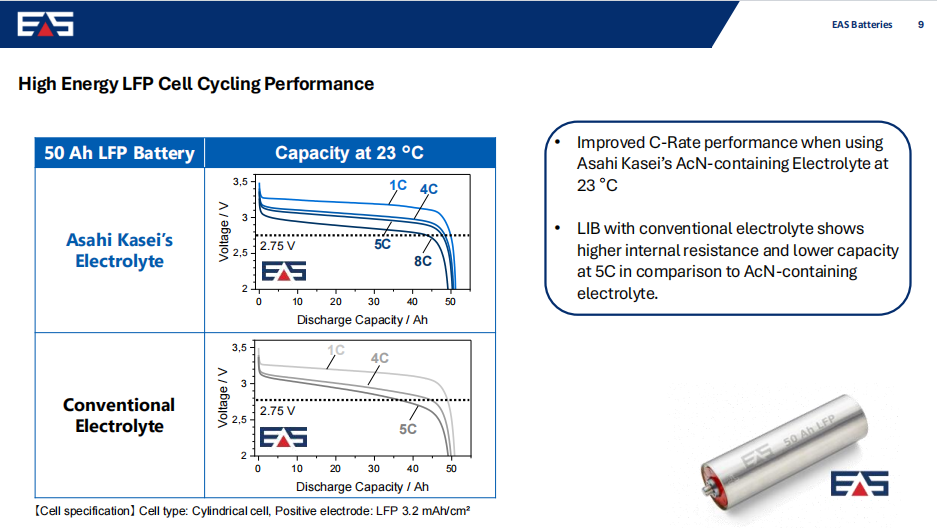 此外,EAS公司的董事总经理Michael Deutmeyer表示,将旭化成电解液技术应用于其以磷酸铁锂(LFP)为正极的圆柱型超高功率锂离子电池,并计划于2026年3月推向市场。同时,EAS公司也计划在葡萄牙建设生产基地用于规模化生产,专注于高功率和高能量的磷酸铁锂电池。其应用包括但不仅限于海事,工程,电动汽车,移动出行等相关的工业领域。