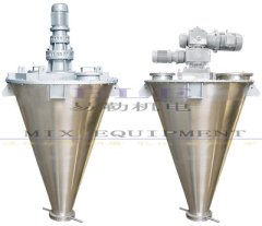 EGS型锥形双螺旋混合机的搅拌部件为两条不对称悬臂螺旋;长短各一,它们在绕自己的轴线转动(自转)的同时,还环绕锥形容器的中心轴;借助转臂的回转在锥体壁面附近又作行星运动(公转);该设备通过螺旋的公、自