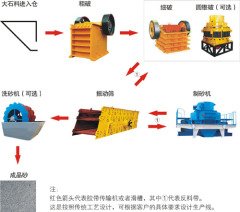我公司生产的全套制砂生产线设备,为您提供全面的技术支持,制砂生产线通常由振动给料机、颚式破碎机、直通冲击式破碎机(制砂机)、振动筛、洗砂机、胶带输送机、集中电控等设备组成;设计产量一般为50-500吨