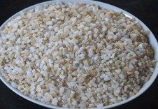 水法生产石英粉,主要设备有磕石机、石碾、烤房、振动筛、水路系统等。其工艺流程大致如下:石英石矿料经过磕石机加工成较小石料,石料再经过石碾碾压成砂粒,碾压时不停的加水,水带着砂粒流入沉淀池内,再把沉淀池