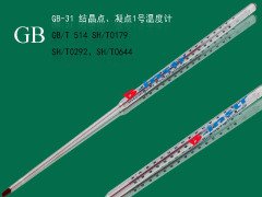 PULL系列凝点温度计,凝点1号温度计,结晶点、结晶点、凝点2号温度计,玻璃液体温度计、温度计是一种经过人工烧制、灌液等十几道工艺制作而成的传统测温产品,符合GB/T514《石油产品试验用玻璃液体温度