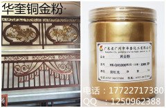 广州市华奎铜金属粉是一种浮型片状颜料,由一定比例的铜、锌和铝合金,经熔炼、球磨、分级到所需要的规格和效果而成。铜金粉的色相可分为黄金粉、青金粉、红金粉、紫铜粉、古铜粉等。铜金粉类,是一种高级金属颜料,