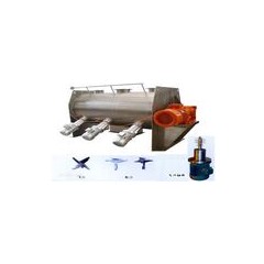 刀式混合机由圆形筒体、传动机构、犁刀、飞刀四部分组成;工作时,犁刀做圆周运动,物料被犁刀刀面分流成两个方向形成双向物料流,与两侧犁刀分流过来的物