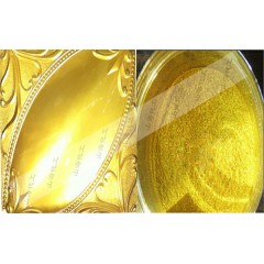 山海化工颜料高亮闪的999黄金粉又称金箔粉,做出产品颜色纯正,亮度高,适用于铁艺,工艺品,佛像,雕塑等工程。此效果并非普通珠光粉可比拟。山海化工黄金粉产品能够广泛应用于涂料、塑料、油墨、皮革、印刷、印