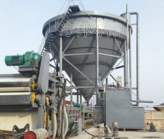 深锥浓缩机为上部圆筒形、下部圆锥形的机体。顾名思义,其锥体较深。深锥浓缩机的工作原理,在添加絮凝剂的条件下,浮选尾煤送入下部带锥形分配口的入料筒。煤泥水中的大部分水在浓缩机圆筒部分的澄清区内流向周边溢