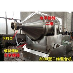 工作原理二维混料机主要由转筒、摆动架、机架三大部分构成。转筒装在摆动架上,由四个滚轮支撑并由两个挡轮对其进行轴向定位,在四个支撑滚轮中,其中两个传动轮由转动动力系统拖动使转筒产生转动,摆动架由一组曲柄