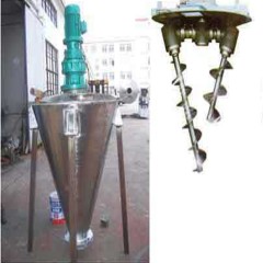 锥形双螺旋混合机两非对称螺旋的快速自转,物料向上提升、形成两股非对称沿筒臂由下向上的螺旋物料流。转臂带动的螺旋公转运动,使螺旋外的物料不同程度进入螺柱包络线内,一部分物料被错位提升,另一部分物料被抛出