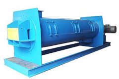 工作原理:连续式混合搅拌机由传动部件、搅拌器、桶体组成。外螺条盘绕形式配合旋转方向把物料从进料端向出料方向推动,而内螺条把物料反向推动,螺带不同的角度、方向绕法使物料产生不同的流动方向,物料通过不断的