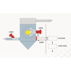 新思备火花探测熄灭系统主要包括:火花探测器,系统本安控制器,自动灭火组件,增压水系统等部件。火花探测熄灭系统,在火花进入粉尘处理设备前探测火花和余火的存在,并在探测点的下游启动灭火组件,300毫秒内熄