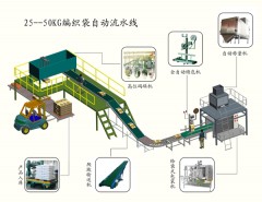 25-50KG自动包装称重剔除自动码垛流水线介绍及其功能与流程图一、流程说明与功能:25KG自动包装机--自动称重剔除-自动金属检测-自动码垛机(可用四坐标码垛机、高低位码垛机、机器人码垛机)用于食品