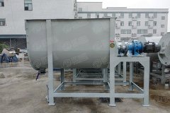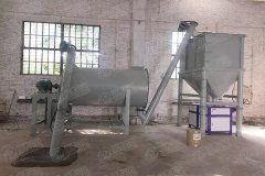 各种干粉类的物料按配方比例经过计算后进入混合机,物料在带状螺旋叶片的推动下进行混合。外螺带将物料从进料端推向出料端,内螺带则使物料向相反的方向运动,里层物料被推倒一侧后由里向外翻滚,外层物料被推倒另一